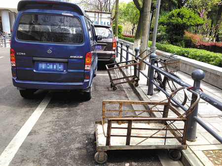 據(jù)面包車司機(jī)和一些買菜的群眾講,因為這一帶車位緊張,有的沿街商戶為了貨車來時卸貨方便,便用推車等雜物放在就近的停車位上,占一個臨時“卸貨位”,“這種情況經(jīng)?吹,上午下午都有,已成常態(tài)。這些人方便了自己,卻把免費停車位變成了‘私有’,給來買菜或辦事的人停車帶來不便。”