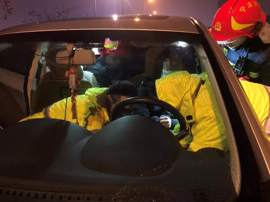 消防員到達(dá)現(xiàn)場后發(fā)現(xiàn),有兩輛車的車頭受損嚴(yán)重,其中一輛車上有一名被困人員。