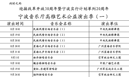 本報(bào)訊(記者陳朝霞)記者從寧波音樂(lè)廳獲悉,為迎接改革開(kāi)放30周年暨寧波實(shí)行計(jì)劃單列20周年,從8月18日至9月26日,寧波音樂(lè)廳將以每張門(mén)票票價(jià)不超過(guò)30元的低價(jià)位,推出高雅藝術(shù)公益演出季第一季,共安排了9場(chǎng)國(guó)內(nèi)一流的藝術(shù)團(tuán)體和個(gè)人的精彩演唱會(huì)。