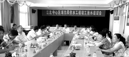 江北中心區(qū)域居民用上水庫水的喜訊,在當(dāng)?shù)鼐用裰胁粩鄠鞑ァ?月2日上午,為聽取居民們對城市供水的意見和建議,市城管局、市自來水總公司在白沙街道辦事處舉行江北中心區(qū)域優(yōu)質(zhì)供水工程竣工通水座談會。
