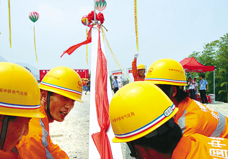 昨天上午,甬臺(tái)溫鐵路電氣化工程寧波東至奉化區(qū)間順利豎起長(zhǎng)9米、重900公斤的首根鐵桿,標(biāo)志著國(guó)家沿海大通道浙江境內(nèi)的重要控制性項(xiàng)目——甬臺(tái)溫鐵路電氣化工程全面展開(kāi)。該工程由曾參加過(guò)青藏鐵路建設(shè)的中鐵電氣化局承建。據(jù)介紹,該鐵路全長(zhǎng)282公里,兩旁需立7956根電氣化桿,全線采用進(jìn)口普拉塞恒張力架線車新工藝,可有效提高接觸網(wǎng)平滑度,為列車高速運(yùn)行打下堅(jiān)實(shí)的技術(shù)基礎(chǔ)。工程計(jì)劃明年1月底建成。