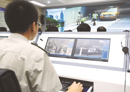 圖為城管人員通過數(shù)字化城管系統(tǒng)實(shí)施城市管理。