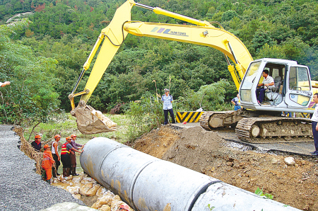據(jù)負(fù)責(zé)搶修峙后段的象山縣公路段副段長(zhǎng)錢挺介紹,5日深夜,一組路政工作人員趕到泗長(zhǎng)線時(shí)看到,被山洪深深扯裂的一道近6米寬的口子橫亙?cè)诠飞,?米高的路基已被山洪沖得無(wú)影無(wú)蹤,山洪沖垮柏油公路后直沖入海。為此,幾十位路政搶修工作人員在迅速清理完靠前的大面積塌方后,再用一袋袋裝滿黃泥的編織袋填埋缺口,等到一輛輛載著水泥涵管的車輛陸續(xù)趕到后,各類大型機(jī)械設(shè)備很快投入最后的搶修工作……
