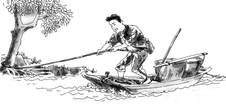 再一次見到這拉拉渡是在雨后的一天。連日大雨,河水暴漲。因為附近開閘放水,河流湍急。只見那拉拉渡被水沖到河的中央,船首尾的兩條繩索繃得緊緊的,在急流中時隱時現(xiàn)。此時此景,我突然想起古詩中“春潮帶雨晚來急,野渡無人舟自橫”的句子來。眼前這拉拉渡,不是那無人的渡口、自橫的船舟嗎?