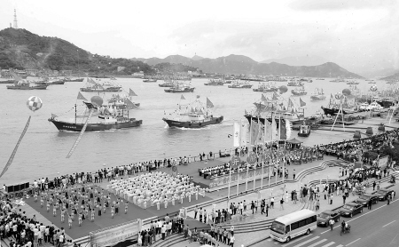 中午時分,副市長陳炳水宣布開漁。頓時,一艘艘已經(jīng)起錨的漁輪汽笛齊鳴,在喧天的號角、鞭炮聲中,首尾相接地駛離石浦漁港,向大海遠處駛?cè)ァ?/p>