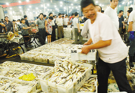 記者在江東水產(chǎn)批發(fā)市場看到,帶魚、鯧魚、鰻魚、大小黃魚擺滿了攤頭,交易相當(dāng)紅火!皞頭比去年的大,品質(zhì)更好!倍嗄杲(jīng)營水產(chǎn)的市場負(fù)責(zé)人戎永敢稱,開漁第一天,由于受臺風(fēng)“森拉克”影響,我市只有一半漁船出海,因此“第一網(wǎng)”到港時間比往年推遲了一天,但今年第一航次捕獲的魚貨普遍量多貨好,主要品種為帶魚、鯧魚、馬鮫魚等。像野生大黃魚有1公斤重,一下子就被甬城酒店買走。從交易情況看,盡管總體價格變化不大,但部分品種已受到了“開漁第一網(wǎng)”的沖擊,平均批發(fā)價格下降了5%-8%。昨晚江東水產(chǎn)市場共成交300噸水產(chǎn),其中東海水產(chǎn)超過六成多。