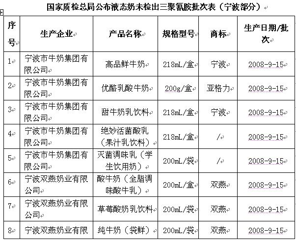 據(jù)了解,所謂的“乳制品”包括液體乳、乳粉和其他乳制品三大類。我市目前尚無乳粉生產(chǎn)企業(yè),液體乳生產(chǎn)企業(yè)共計(jì)3家,分別為寧波市牛奶集團(tuán)有限公司,寧波雙燕奶業(yè)有限公司、寧?h利豐牧業(yè)有限公司!叭鼓谭邸笔录l(fā)生后,市質(zhì)監(jiān)部門立即對(duì)上述液態(tài)奶生產(chǎn)企業(yè)進(jìn)行了專項(xiàng)檢查,重點(diǎn)檢查企業(yè)是否嚴(yán)格執(zhí)行進(jìn)貨驗(yàn)收制度、有無使用非食品原料和非法添加物質(zhì)、生產(chǎn)加工環(huán)節(jié)管理是否規(guī)范、是否嚴(yán)格執(zhí)行產(chǎn)品出廠檢驗(yàn)等,同時(shí)對(duì)企業(yè)產(chǎn)品進(jìn)行了質(zhì)量抽樣。從現(xiàn)場(chǎng)檢查結(jié)果看,我市液態(tài)奶生產(chǎn)企業(yè)均對(duì)原奶的蛋白質(zhì)、脂肪、乳糖、抗生素、菌落總數(shù)含量等指標(biāo)進(jìn)行了投產(chǎn)前檢驗(yàn),并明確生產(chǎn)過程關(guān)鍵質(zhì)量點(diǎn),制定關(guān)鍵質(zhì)量點(diǎn)操作程序和作業(yè)指導(dǎo)書,切實(shí)實(shí)施質(zhì)量控制,產(chǎn)品出廠前都經(jīng)過企業(yè)實(shí)驗(yàn)室檢驗(yàn)并作相應(yīng)記錄。此外,此次檢查未發(fā)現(xiàn)企業(yè)存在使用非食品原料和非法添加物質(zhì)的情況。