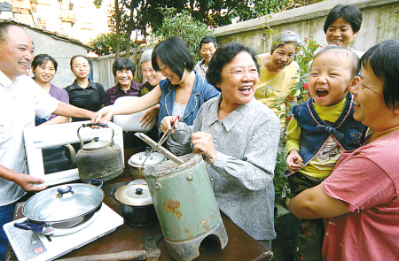 昨天下午,鎮(zhèn)海區(qū)招寶山街道城東社區(qū)居民李欽娣老人(右四),正在向鄰居們講述過去使用煤球爐的經(jīng)歷。這幾天,該社區(qū)居民正忙著整理煤球爐、煤油爐、火鉗、柴斧、竹瓢、風箱等老廚具,為社區(qū)將舉辦的“30年廚房看變化”展覽送上實物展品! 。êㄈA 朱 聰 程紅霞 攝)