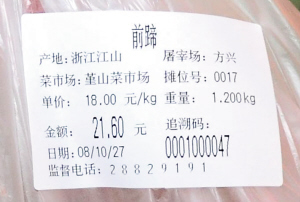 豬肉零售環(huán)節(jié)的IC卡交易系統(tǒng)昨天開始在鄞州堇山菜市場正式投入使用,市民在那里買的每一塊豬肉,都會(huì)貼上電腦小票,小票上有菜市場名稱、攤位號(hào)、單價(jià)、重量、金額等信息,還標(biāo)明了豬肉的產(chǎn)地、屠宰場名稱和一個(gè)10位數(shù)字的追溯碼。一旦發(fā)生豬肉質(zhì)量問題,能迅速通過小票知道豬肉來自哪個(gè)屠宰場,是哪個(gè)養(yǎng)殖戶養(yǎng)殖的豬。