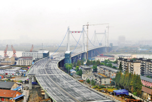 昨天,我市第一座雙塔雙索面自錨式懸索橋——慶豐橋主線建成,力爭11月初實現(xiàn)主線通車。這座橋上設(shè)置了兩部觀光電梯,市民今后可以乘坐電梯上橋看風(fēng)景。記者 劉波 攝