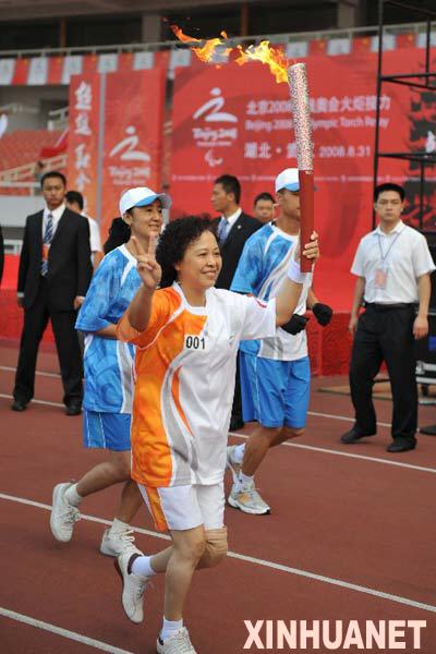 8月31日,第一棒火炬手程瑜手持火炬?zhèn)鬟f。當(dāng)日,北京殘奧會(huì)圣火在武漢進(jìn)行傳遞。 新華社記者郝同前攝