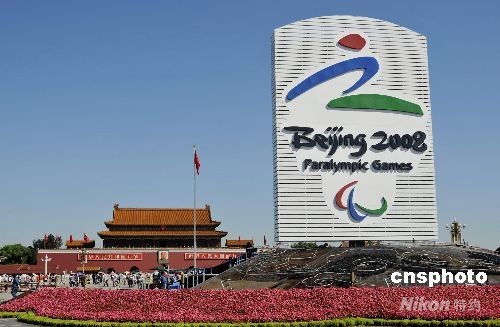 9月1日,北京2008年殘奧會(huì)會(huì)徽“天地人”屹立在北京天安門廣場。會(huì)徽以天、地、人和諧統(tǒng)一為主線,把中國的文字、書法和殘疾人奧林匹克運(yùn)動(dòng)精神融為一體,集中體現(xiàn)“心智、身體、精神”和諧統(tǒng)一的殘疾人奧林匹克運(yùn)動(dòng)精神,具有深厚的中國傳統(tǒng)文化底蘊(yùn)。殘奧會(huì)開閉幕式將分別于9月6日和17日晚8點(diǎn)在北京的國家體育場“鳥巢”舉行。中新社發(fā)王宇婷 攝