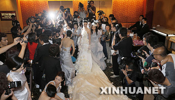 10月2日,新娘陳慧琳受到眾多記者追訪。新華社記者 周磊 攝