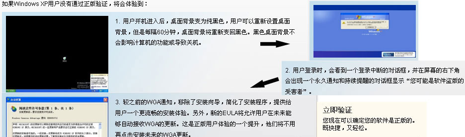 ——Windows正版增值計(jì)劃通知(簡稱WGA)和Office正版增值計(jì)劃通知(簡稱OGA)。屆時(shí),盜版XP專業(yè)版用戶的桌面背景每隔1小時(shí)將被成純黑色,盜版Office用戶軟件上將被永久添加視覺標(biāo)記。國內(nèi)用戶對微軟“黑屏”的做法反應(yīng)劇烈。
