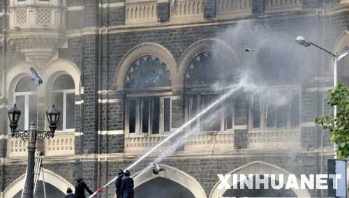 圖為消防人員在孟買泰姬瑪哈酒店外滅火 2008年11月29日 印度軍方宣布在孟買泰姬瑪哈酒店的清剿行動已經(jīng)結(jié)束 新華社 王曄攝