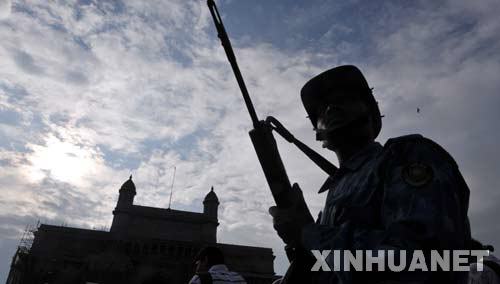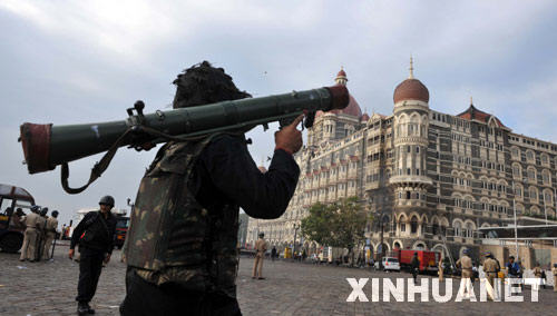 一名印度快速反應(yīng)部隊人員在孟買泰姬瑪哈酒店前戒備 2008年11月29日 印度軍方宣布在孟買泰姬瑪哈酒店的清剿行動已經(jīng)結(jié)束 新華社 王曄攝