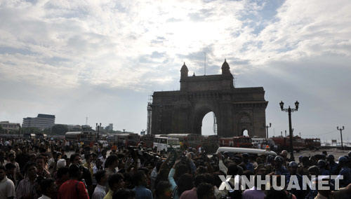記者們在孟買泰姬瑪哈酒店前的印度門前采訪 2008年11月29日 印度軍方宣布在孟買泰姬瑪哈酒店的清剿行動已經(jīng)結(jié)束 新華社 王曄攝