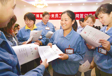 浙江廣博集團(tuán)有限公司外來(lái)員工在簽訂勞動(dòng)合同時(shí),高興得合不攏嘴——企業(yè)已把外來(lái)員工免費(fèi)享受五大保險(xiǎn)的內(nèi)容寫進(jìn)了合同。(胡建華 攝)