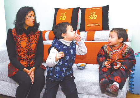 昨天上午,當(dāng)記者敲開羅西妮的家門,一串長(zhǎng)長(zhǎng)的紅燈籠和一串鮮艷的紅辣椒躍入眼簾,伴隨著女主人親切的一聲“歡迎,請(qǐng)進(jìn)”,恍如來(lái)到了一戶地道的寧波市民家庭。緊接著伸出來(lái)兩個(gè)小腦袋,兩雙調(diào)皮的眼睛好奇地打量著我們。沒(méi)等母親羅西妮示意,身穿唐裝的小兄弟倆就口齒清晰地蹦出一句“新年快樂(lè)”來(lái)?磥(lái),中國(guó)的禮儀文化正慢慢顯現(xiàn)在兩個(gè)孩子的言行之中。